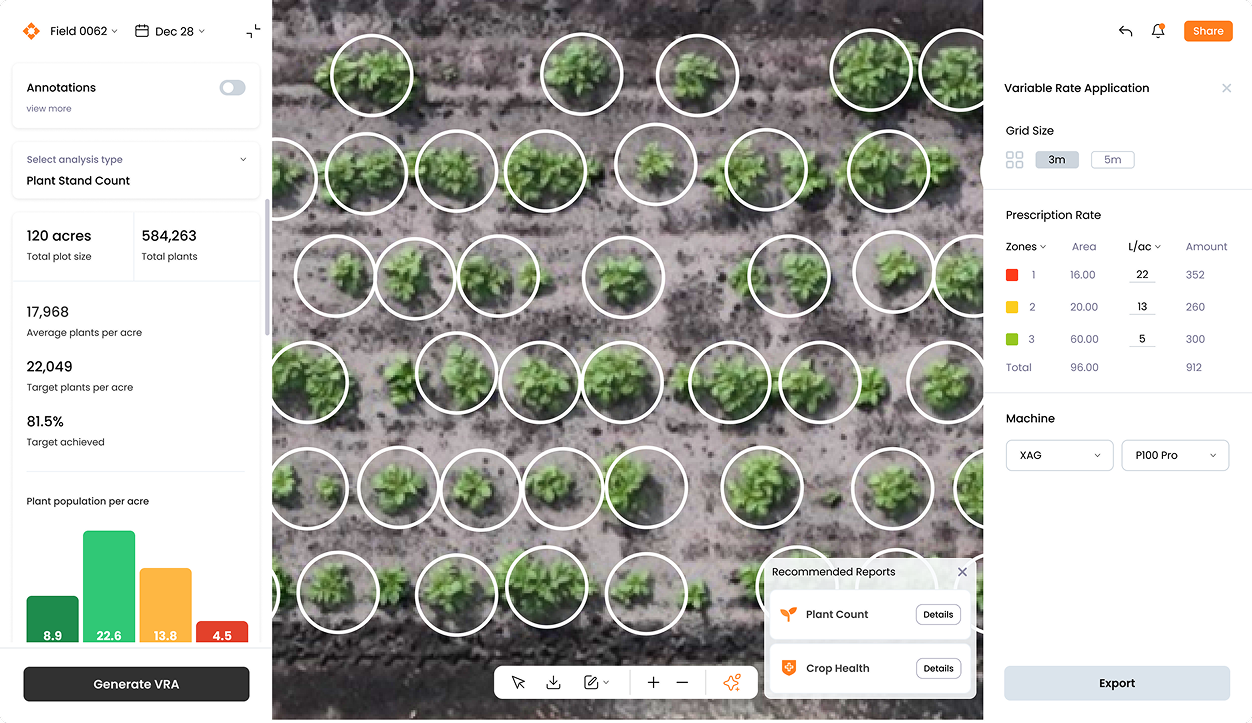 Automated drone analysis that delivers stand counts, crop health indicators, and early yield signals, without the need for manual field scouting.