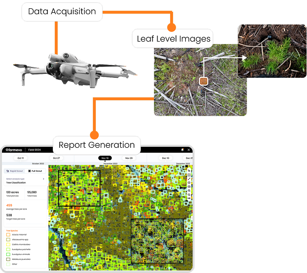 Collect forest imagery using readily available drones and Farmevo’s mobile app, no specialized sensors or complex flight planning required.